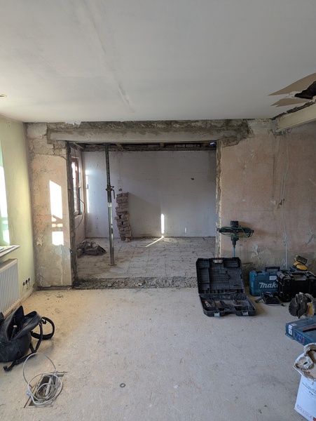 EFH mit folgenden Aufgaben: Durchbruch zwischen zwei Zimmern mit aufgesetzter Schiebetüren-Situation, Modernisierung des Wohnzimmers v.a. Auffrischung, Abklärung und Sanierung der Treppenhauswand, da